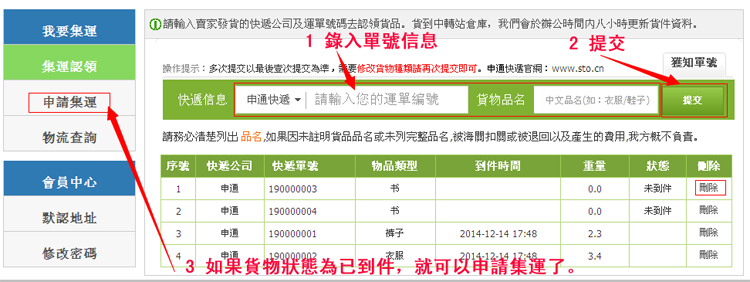 第三步:貨物登記,登入後, 將您已買到貨品的快遞公司及快遞單號輸入並提交.賣家發貨后即會有快遞運單號,請第一時間認領,這樣我們簽收貨物后即會顯示已入倉