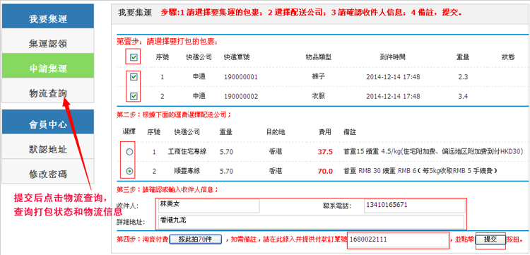 第四步:申請集運後,淘寶付款!錄入付款訂單號,並點提交即可!